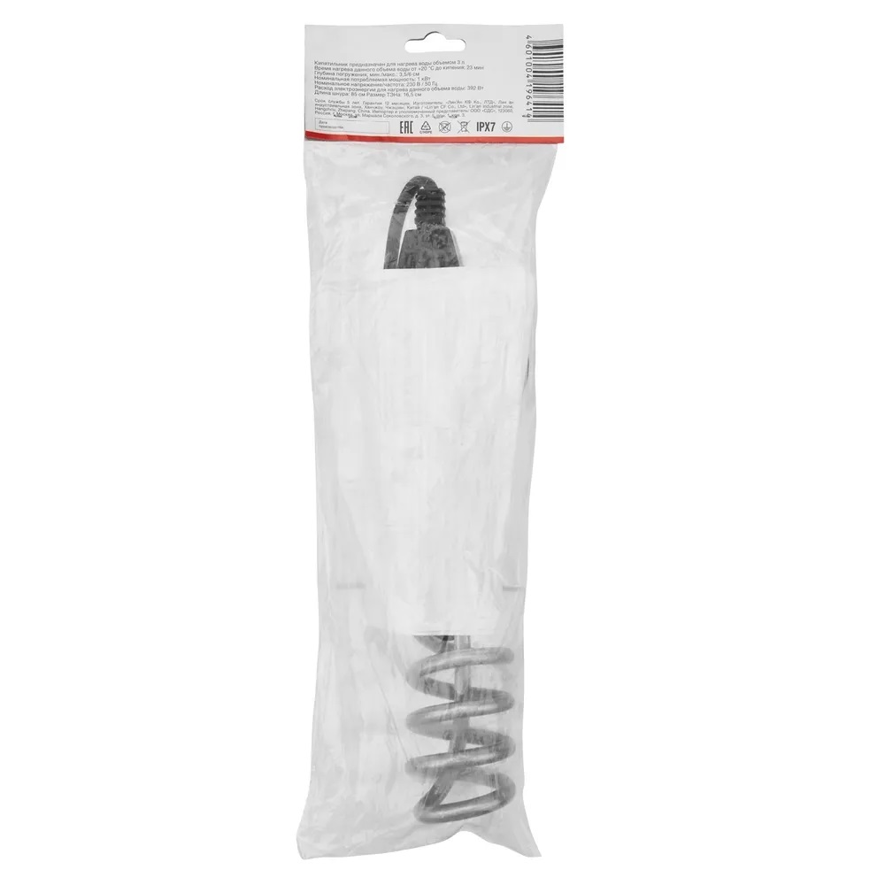 Также он может пригодиться в домашних условиях, когда невозможно нагреть воду при помощи газовой плиты. Прибор состоит из нагревательного элемента (ТЭНа), термостойкой рукоятки, шнура питания с евровилкой и специального крючка для комфортной установки устройства в емкость с водой. Кипятильник предназначен для нагрева воды объемом 3 л.