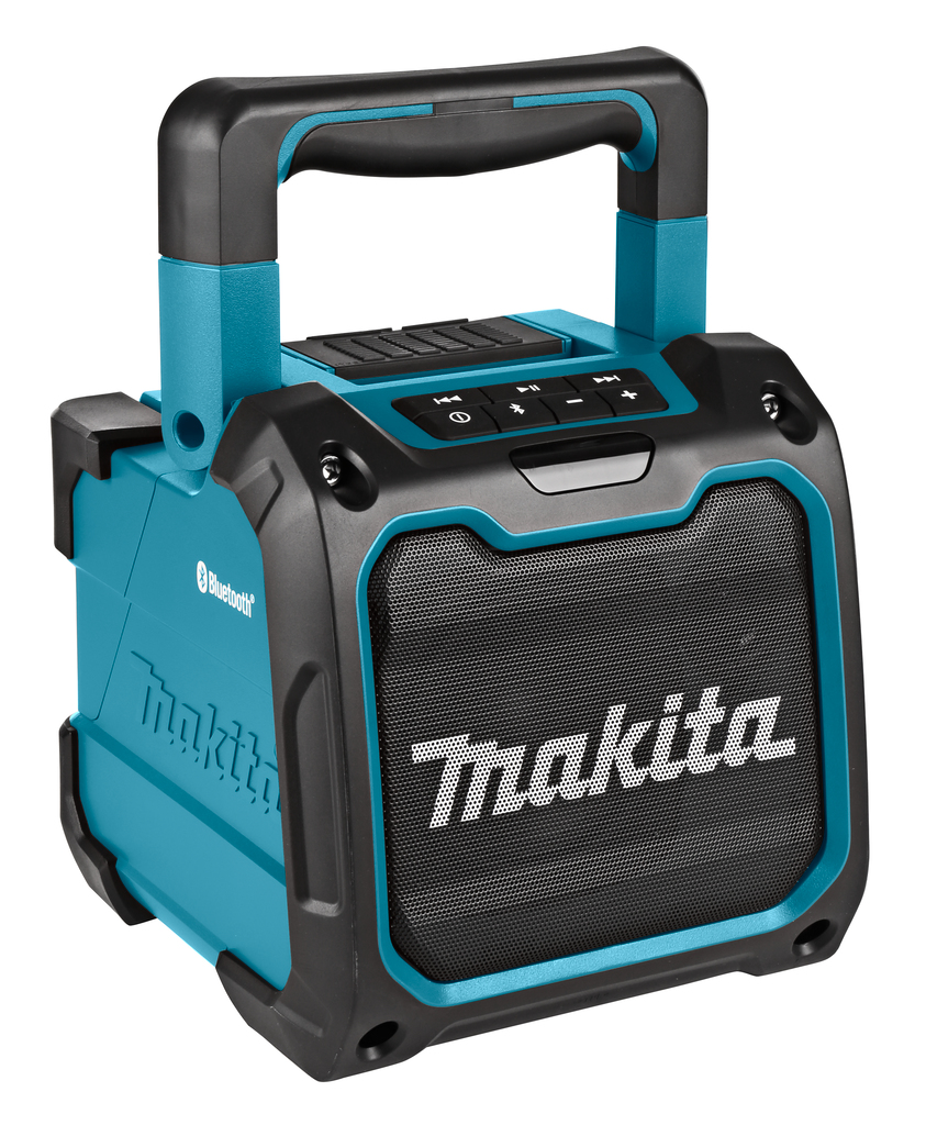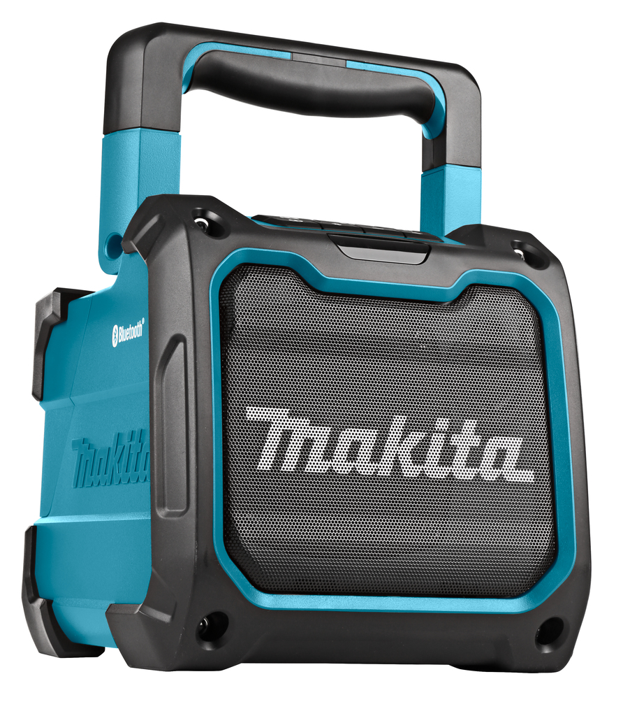 Makita DMR200 - мощная звуковая колонка с возможностью работать от аккумуляторов Макита с напряжением от 10.8 до 18 Вольт или от сети с помощью AC/DC адаптера. Связь с источником звука через аудиоразъем или по Блютузу, может использоваться как зарядное устройство для сотовых телефонов.