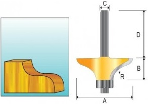 Фигирейная горизонтальная фреза с опорным подшипником Макита Д-11807 S-образной формы с хвостовиком 12 мм. Используется для фрезерования кромок деревянных заготовок и готовых изделий. Диаметр фрезы А=63.5 мм, длина режущей части В=19 мм, диаметр хвостовика С=12 мм, длина хвостовика D=38 мм, диаметр подшипника 12.7 мм, радиус R=9.25 мм, количество режущих кромок 2.