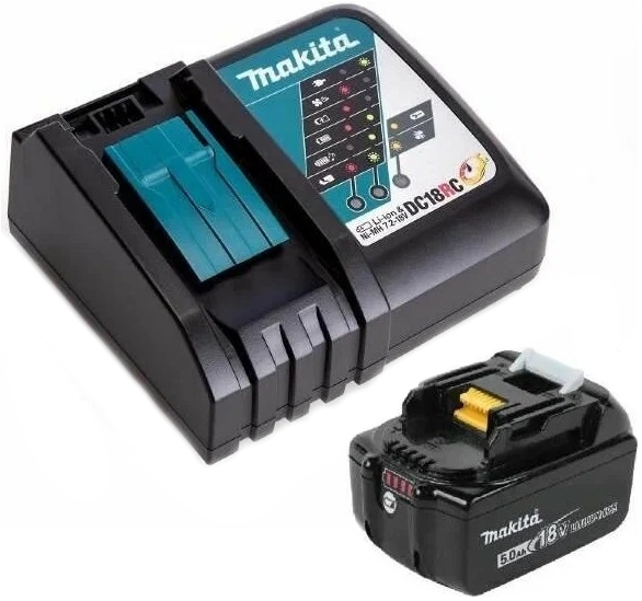 Набор питания Makita 191A55-0 состоит из быстро зарядного устройства Makita DC18RC с аккумулятором Makita BL1850B с индикацией уровня заряда.