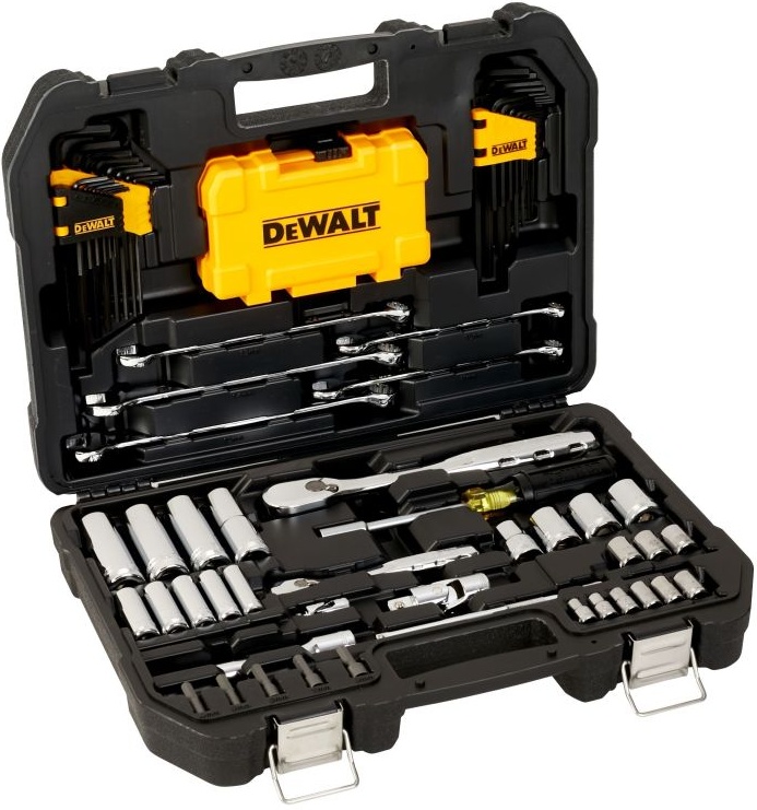 Универсальный набор ручного инструмента и оснастки DEWALT включает в себя 89 предметов, необходимых при любых операциях фиксации или демонтажа. Инструмент изготовлен из кованой стали для высокой прочности, а полированное хромированное покрытие защищает металл от коррозии. В комплекте кейс для переноски и хранения набора.