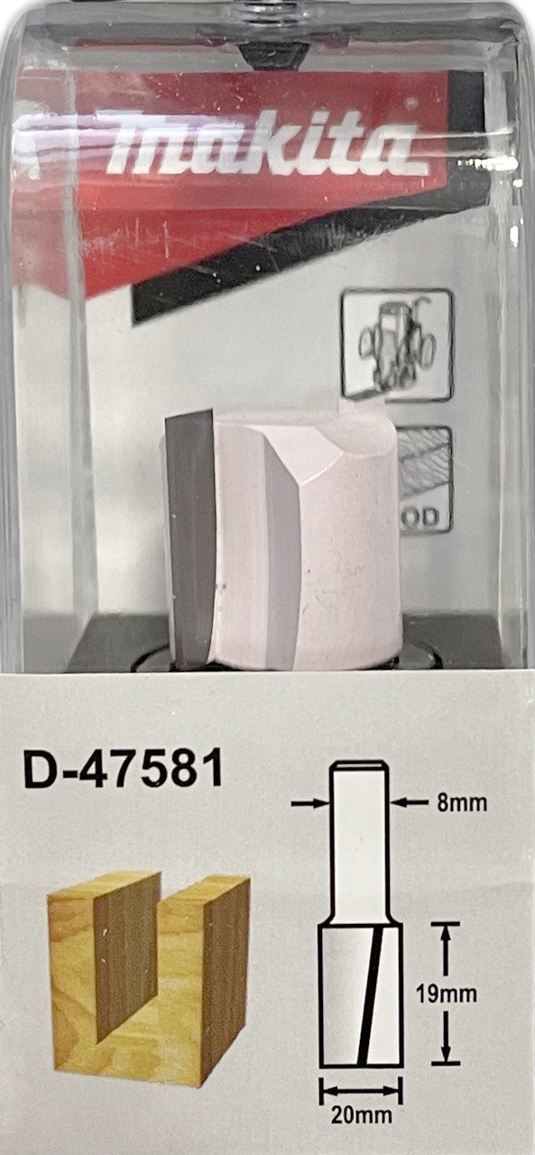 Пазовая фреза Makita D-47581 с двумя режущими кромками для выборки пазов. Подходит к триммерам и фрезерам Макита с диаметром цанги 8 мм. Длина 51 мм, диаметр режущей части 20 мм, длина режущей части 19 мм, хвостовик 8 мм.