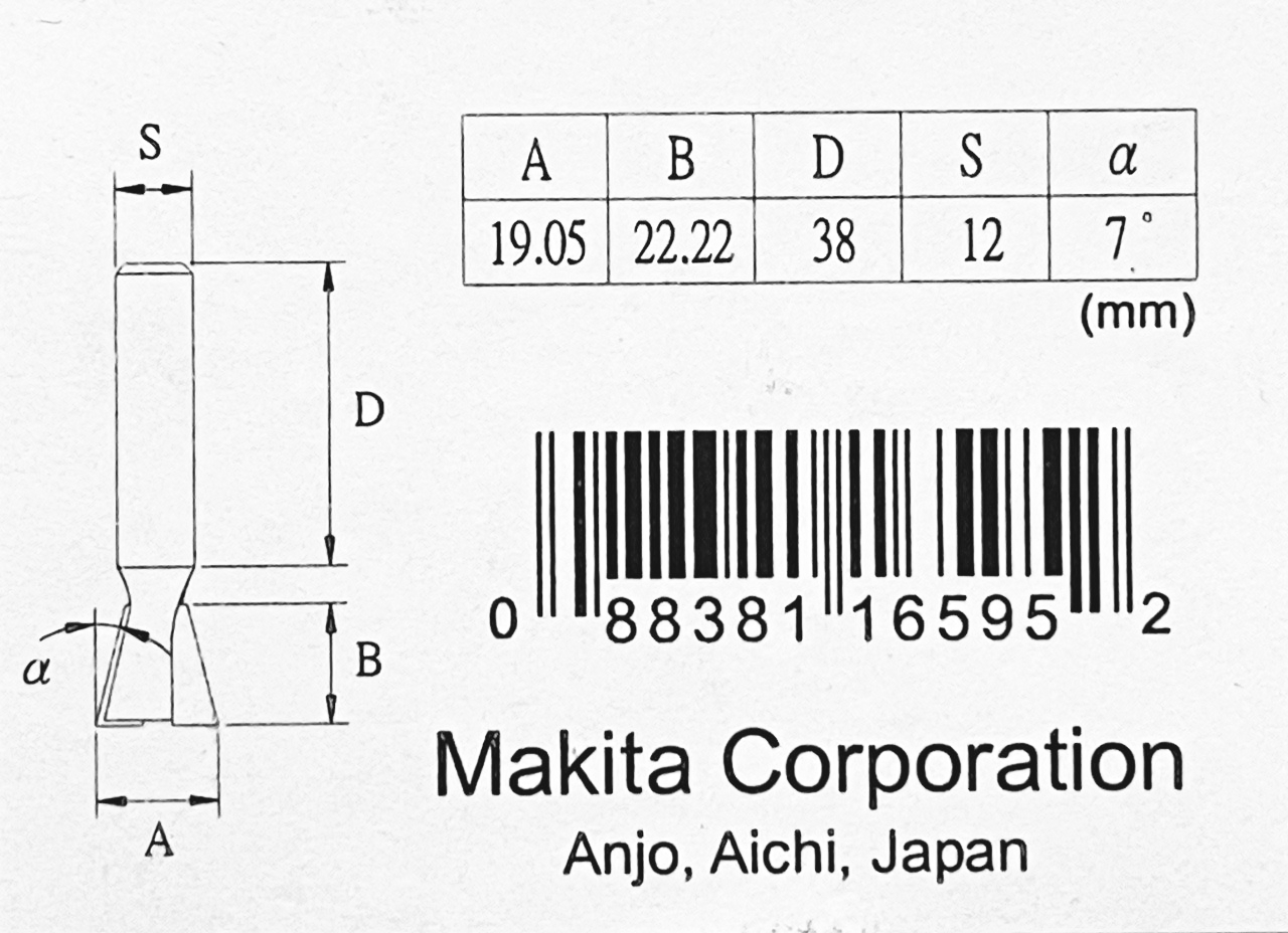 Диаметр 19.05 мм, длина режущей части 22.22 мм, хвостовик 12 мм, длина 38 мм, угол 7 градусов, имеет 2 режущих кромки. Подходит для фрезерования точных открытых, полуоткрытых и закрытых пазов в массивной и клееной древесине.