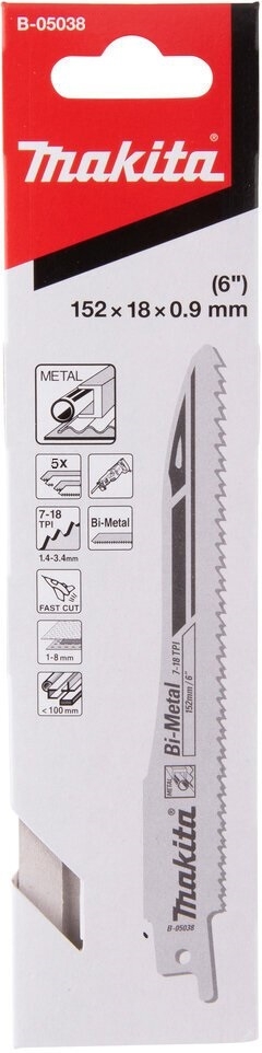 Биметаллическое полотно Super Express Makita B-05038 предназначено для сабельных пил Макита и обладает исключительной прочностью и гибкостью, обеспечивает высокую скорость резки и имеет долгий срок службы. Используется для резки чугуна, металла 1.5-8 мм и пластика 5-77 мм.