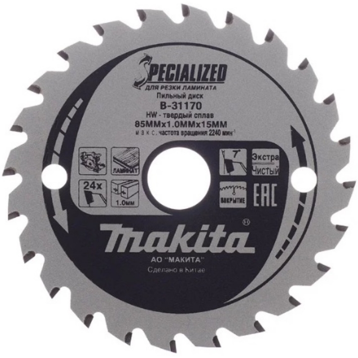 Пильный диск для ламината Makita B-31170 (аналог: B-29430) - диск премиум-класса, предназначен резки для ламината совместно с пилами Makita HS300, HS301. Диск Макита В-31170 обладает высокой надежностью, производительностью и увеличенным ресурсом. Уменьшает перегрузку, сохраняет аккумулятор и защищает двигатель инструмента. Благодаря специальной форме зуба, диск обеспечивает высокое качество работы. Диск подходит для любых сортов древесины, и способен выполнять как продольный, так и поперечный распил. Купить пильный диск по ламинату 85х1.0х15 мм, 24T, ATAF для аккумуляторных пил HS300, HS301 Makita B-31170, очень просто, достаточно положить товар в «корзину» и оформить заказ или позвонить нам по телефону, так же можно для Вашего удобства, отправить заявку на Е-майл.