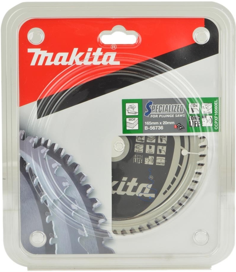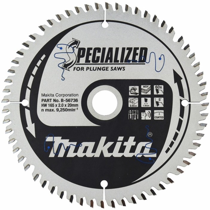 Пильный диск Makita B-56736 специально разработан для аккумуляторной погружной пилы Makita DSP600, DSP601. Имеет строго отбалансированное лезвие с тщательно выверенным натяжением, что обеспечивает особенно гладкий рез дерева, МДФ, ламината.