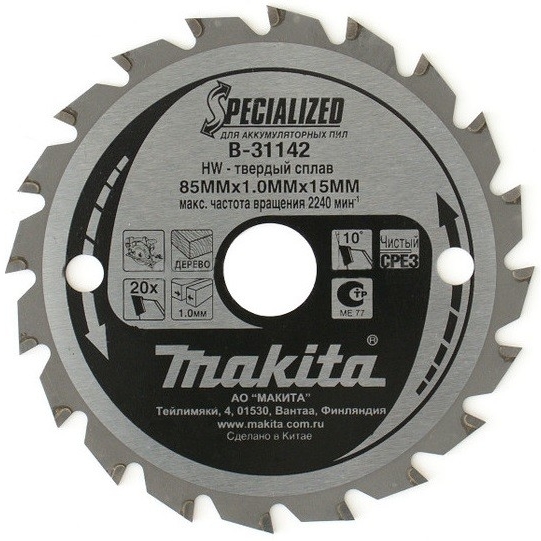 Пильный диск для аккумуляторных пил Makita B-31142 (аналог: 792623-5, B-14607, B-09704, B-09204) - диск премиум-класса, предназначенный для ручных аккумуляторных пил. Диск обладает высокой надежностью, производительностью и увеличенным ресурсом. Уменьшает перегрузку, сохраняет аккумулятор и защищает двигатель инструмента. Благодаря специальной форме зуба, диск обеспечивает высокое качество работы. Диск подходит для любых сортов древесины, и способен выполнять как продольный, так и поперечный распил. Купить пильный диск для дерева 85х1.0х15 мм, 20T, ATB для аккумуляторных пил HS300, HS301 Makita B-31142, очень просто, достаточно положить товар в «корзину» и оформить заказ или позвонить нам по телефону, так же можно для Вашего удобства, отправить заявку на Е-майл.