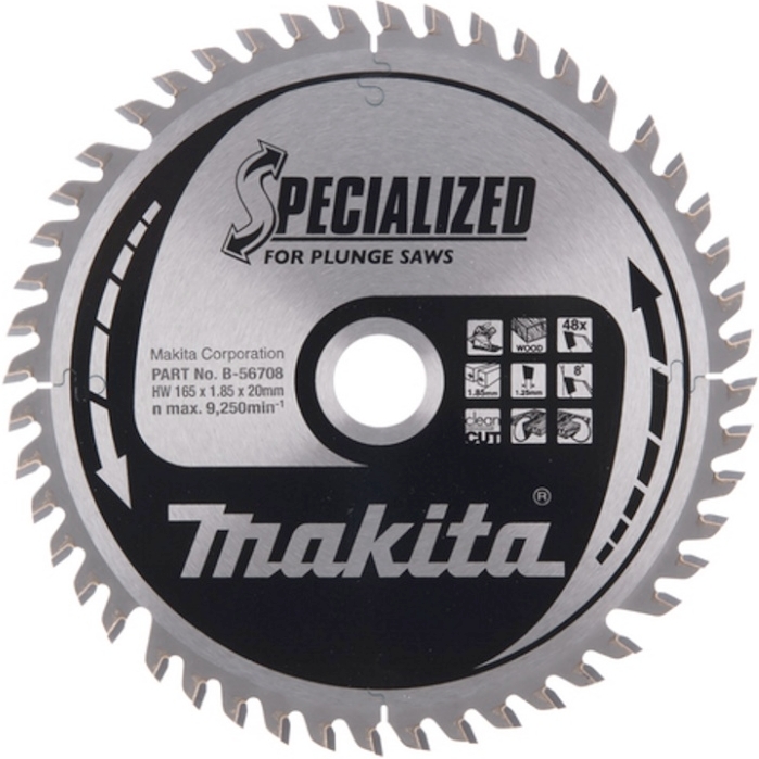 Пильный диск Makita B-56708 специально разработан для аккумуляторной погружной пилы Makita DSP600, DSP601. Имеет строго отбалансированное лезвие с тщательно выверенным натяжением, что обеспечивает особенно гладкий рез дерева. Диаметр диска - 165 мм, внутреннее отверстие - 20 мм, толщина диска - 1.25 мм, толщина пропила - 1.85 мм, число зубьев - 48T, наклон 8°, тип зуба - ATB.