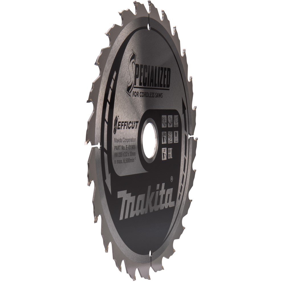 Пильное полотно Efficut является особенно эффективным полотном для аккумуляторной циркулярной пилы благодаря новой конструкции зубьев. Зуб имеет полый вырез. В результате зуб имеет меньшую поверхность контакта с обрабатываемым материалом, он более острый и из-за вогнутости лучше теряет заготовку. Также имеется лазерная прорезь для уменьшения вибраций и шума, а также тефлоновое покрытие, защищающее от коррозии и прилипания адгезионных материалов. Эти методы и толщина полотна всего 1 мм обеспечивают быстрое и эффективное пиление со значительно меньшим пылеобразованием: ДСП облицованная меламином; МДФ; Ламинат; Древесина. В нашем интернет магазине MAKITA.ONE, Вы можете купить товар – Диск пильный для дерева EFFICUT, 235x30х2.2 мм, 24T Makita E-01909. Оформить покупку легко с помощью корзины или отправить запрос нам на электронную почту. Подробную информацию по товару вы можете получить у наших менеджеров или в службе технической поддержки Макита по телефонам указанным на сайте.
